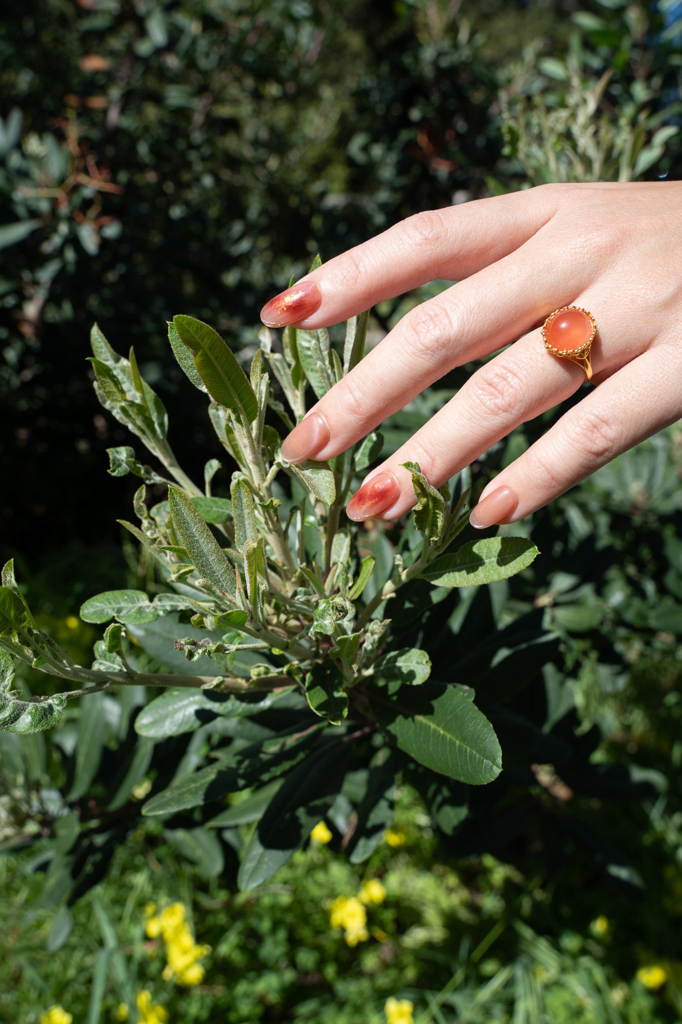 A sophisticated blend of deep amber smudging and a shimmering cat-eye finish. Accented with delicate hand-painted gold for a touch of timeless elegance.